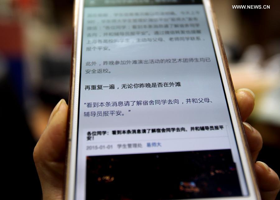 Photo taken on Jan. 1, 2015 shows a university's official Weixin reminding students contacting parents and school authorities proactively in Shanghai, east China. New Year celebrations in Shanghai's bund area went astray Wednesday night as a stampede resulted in 36 people dead and 47 injured. The city has set up a working team for rescue operations and to deal with the aftermath. (Xinhua/Liu Ying)