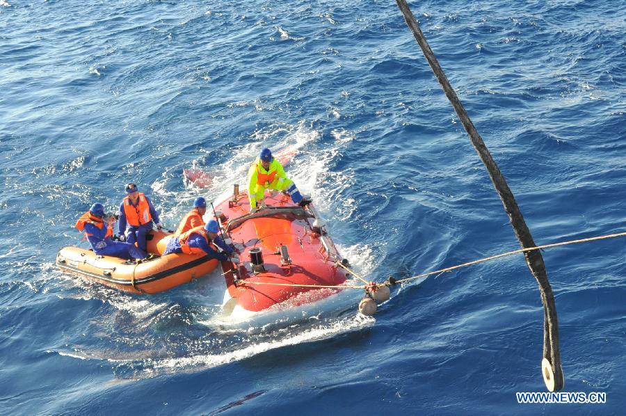 China's deep sea manned submersible Jiaolong is seen in the Indian Ocean, Jan. 2, 2015. Jiaolong carried out the first dive on a mission to study active hydrothermal vent in the southwestern Indian Ocean on Jan. 2. It was the first time for the submersible to take the second batch of pilot trainees in the diving, which was intended to enable the trainees to learn some skills of submersible operation in active hydrothermal vent and collect samples of hydrothermal fluid, sulfide, rocks, sediment and water. (Xinhua/Zhang Xudong)