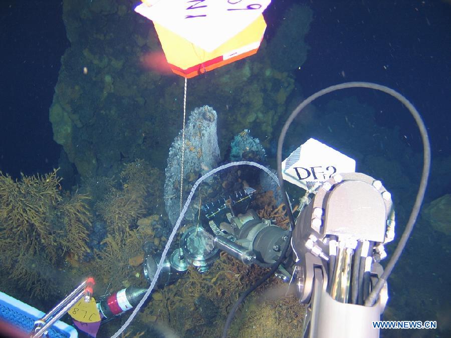 | China's deep sea manned submersible Jiaolong collects samples on a hydrothermal vent in the Indian Ocean, Jan. 2, 2015. Jiaolong carried out the first dive on a mission to study active hydrothermal vent in the southwestern Indian Ocean on Jan. 2. It was the first time for the submersible to take the second batch of pilot trainees in the diving, which was intended to enable the trainees to learn some skills of submersible operation in active hydrothermal vent and collect samples of hydrothermal fluid, sulfide, rocks, sediment and water. (Xinhua/National Deep Sea Center) |