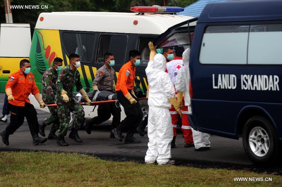 Indonesian search and rescue members carry the body of a victim of AirAsia Flight QZ 8501 from MH-60R Seahawk helicopters in Pangkalan Bun, Indonesia, Jan. 4, 2015. An Indonesian pilot taking part in the multinational search operation said here on Sunday that three more bodies were found in AirAsia crash site off Borneo coast. (Xinhua/Agung Kuncahya B.)