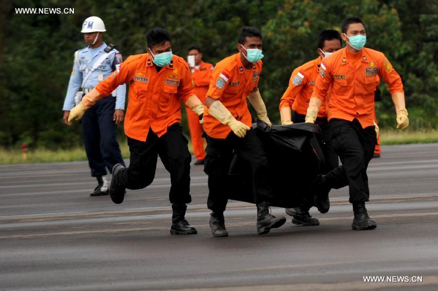 Indonesian search and rescue members carry debris from MH-60R Seahawk helicopters in Pangkalan Bun, Indonesia, Jan. 4, 2015. An Indonesian pilot taking part in the multinational search operation said here on Sunday that three more bodies were found in AirAsia crash site off Borneo coast. (Xinhua/Agung Kuncahya B.)