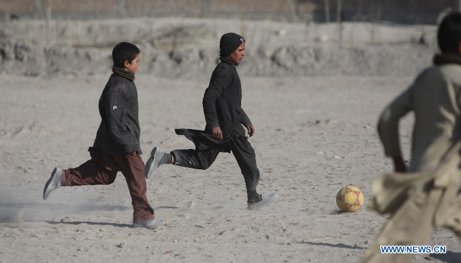 Afghan children play soccer on the dusty ground outside their homes at a slum area in Kabul, Afghanistan on Jan. 3, 2015. (Xinhua/Ahmad Massoud)