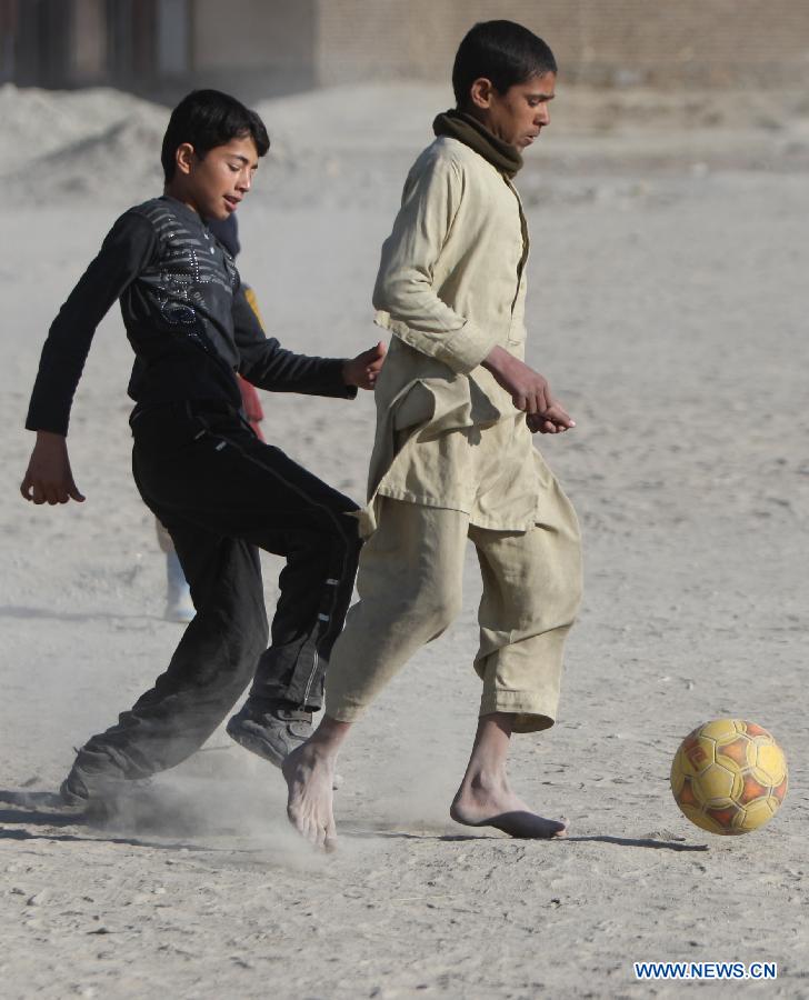 Afghan children play soccer on the dusty ground outside their homes at a slum area in Kabul, Afghanistan on Jan. 3, 2015. (Xinhua/Ahmad Massoud)