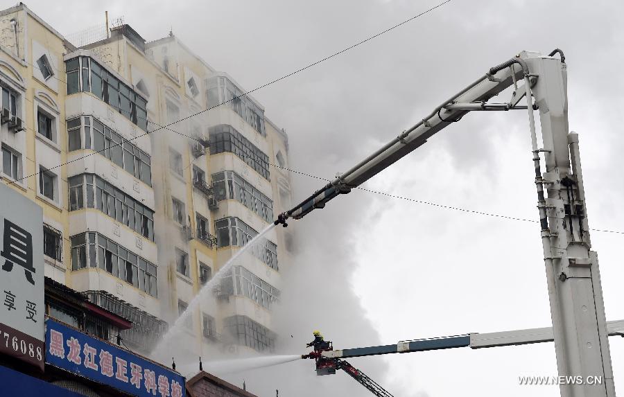Firefighters spray water to a burnt warehouse at the Beifangnanxun ceramics market in Daowai District, Harbin, capital of northeast China's Heilongjiang Province, Jan. 4, 2014. The warehouse blaze in Harbin City that killed 5 firefighters still hasn't been completely extinguished, local firefighters said on Sunday. As of 10:40 a.m. Sunday, a residential building next to the warehouse was still smoldering. Rescuers said that the source of the fire has been hard to determine due to the building's complicated structure, and the building is at risk of collapsing. Firefighters are working from outside to extinguish the flames. (Xinhua/Wang Jianwei)