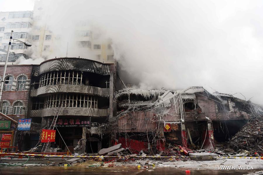 Smokes rise from a burnt warehouse at the Beifangnanxun ceramics market in Daowai District, Harbin, capital of northeast China's Heilongjiang Province, Jan. 4, 2014. The warehouse blaze in Harbin City that killed 5 firefighters still hasn't been completely extinguished, local firefighters said on Sunday. As of 10:40 a.m. Sunday, a residential building next to the warehouse was still smoldering. Rescuers said that the source of the fire has been hard to determine due to the building's complicated structure, and the building is at risk of collapsing. Firefighters are working from outside to extinguish the flames. (Xinhua/Wang Jianwei)
