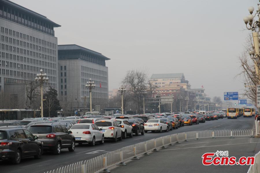 | A general view of heavy traffic on a trunk road in Beijing during morning peak hours on the first workday, Jan 4, 2015. This workday after three-day New Year holiday happens to be Sunday when no private cars in Beijing are banned from the road under the current vehicle restriction rule. [Photo: China News Service/Liu Xianguo] |