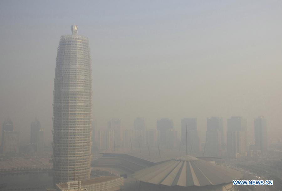 Buildings are shrouded in smog in Zhengzhou, capital of central China's Henan Province, Jan. 4, 2015. China's top meteorological authority forecast medium to severe smog in the country's northern regions including Beijing and Tianjin as well as the neighboring Hebei Province on Sunday. Meanwhile, smoggy weather will also affect the country's eastern province of Jiangsu as well as the southwestern province of Sichuan on Sunday. (Xinhua/Feng Lei)