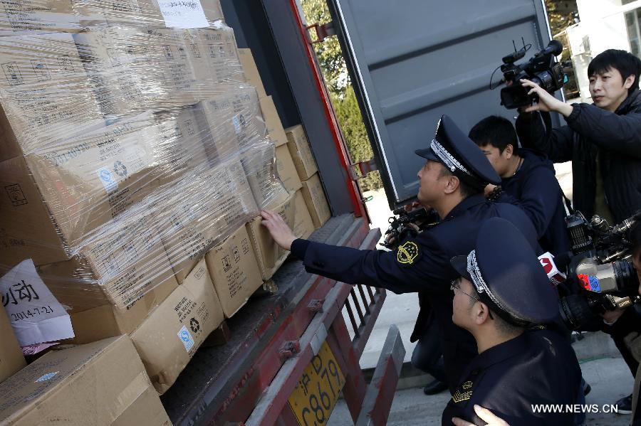 Staff members of Shanghai food and drug administration check Husi's unqualified food before the innocuous treatment in Shanghai, east China, Jan. 4, 2015. A total of 521.21 tons of unqualified food Husi recalled were safely disposed after the last 1415 boxes were disposed on Sunday. Shanghai Husi Food Co., Ltd, a meat supplier for mainly McDonald and KFC, was investigated in July of 2014 for supplying stale meat to McDonald and KFC outlets. (Xinhua/Pei Xin)