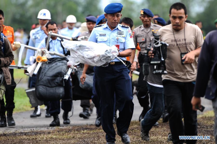 TNII crew members carry debris of AirAsia flight QZ8501 from USS Navy helicopter at Iskandar Air Base, Pangkalan Bun, Central Kalimantan, Indonesia, Jan. 5, 2015. (Xinhua/Veri Sanovri)