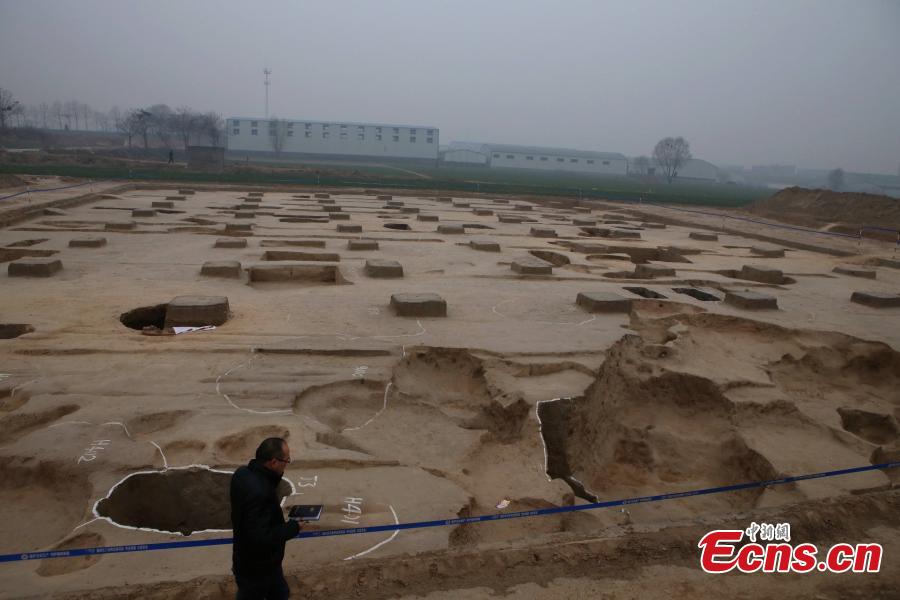 A general view of an archaeological site in Zhengzhou, Central China’s Henan province, Jan 5, 2015. Archaeologists have unearthed a “middle city” at the site, which has a large area composed of 40 sacrificial pits in good order. Archaeologists also found building foundations of a palace in early Shang Dynasty (1600 BC to 1046 BC), covering an area of 3,000 square meters. Henan is an important location of the Shang and Zhou dynasties with a lot of historical relics. [Photo: China News Service/Wang Zhongju]