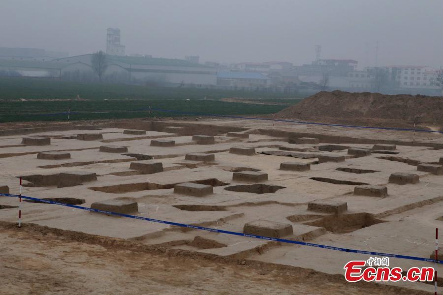A general view of an archaeological site in Zhengzhou, Central China’s Henan province, Jan 5, 2015. Archaeologists have unearthed a “middle city” at the site, which has a large area composed of 40 sacrificial pits in good order. Archaeologists also found building foundations of a palace in early Shang Dynasty (1600 BC to 1046 BC), covering an area of 3,000 square meters. Henan is an important location of the Shang and Zhou dynasties with a lot of historical relics. [Photo: China News Service/Wang Zhongju]