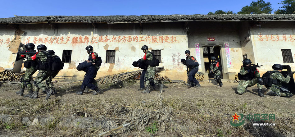 The armed police frontier force conducted an across-regional military exercise in south China’s Guangdong province on Dec. 29, 2014. Over 1,000 soldiers traveled 300 kilometers to encircle and suppress a drug-producing village and rescue hostages. All the training subjects were completed successfully. (www.81.cn/Liao Jian)