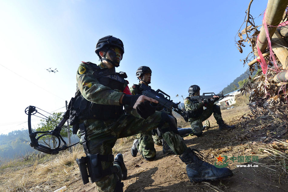 | The armed police frontier force conducted an across-regional military exercise in south China’s Guangdong province on Dec. 29, 2014. Over 1,000 soldiers traveled 300 kilometers to encircle and suppress a drug-producing village and rescue hostages. All the training subjects were completed successfully. (www.81.cn/Liao Jian) |