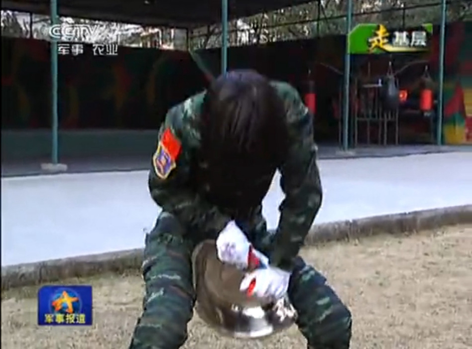 Photo shows a female SWAT member in Sichuan ripping apart a steel wash basin barehanded. Four hours physical training every day turns an ordinary woman into an invincible soldier. (Photo/CCTV)