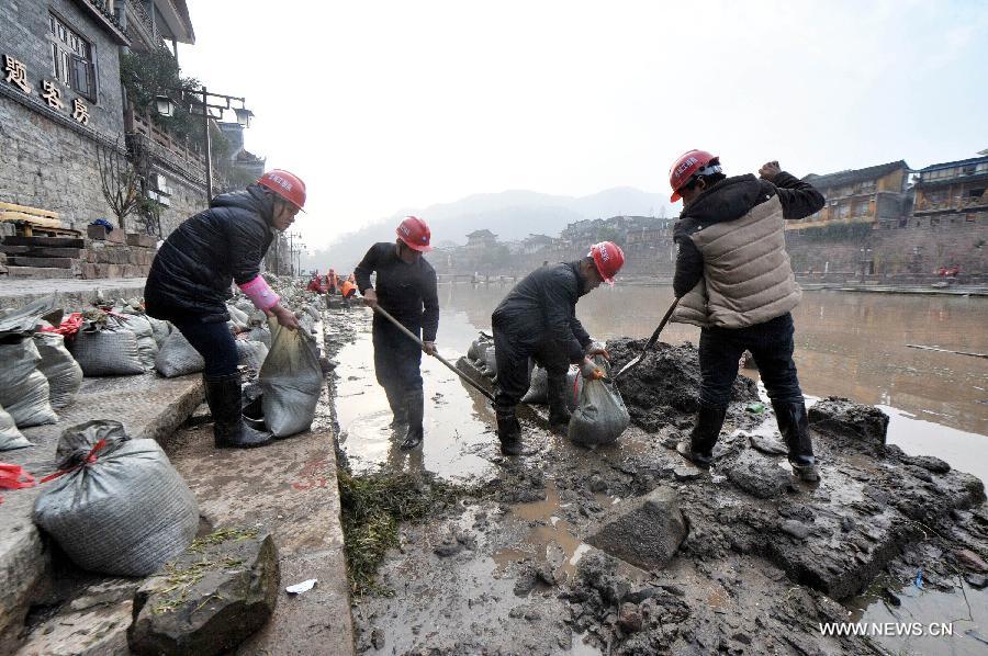 Workers the Tuojiang River in the ancient town of Fenghuang, central China's Hunan Province, Jan. 7, 2015. A dredging operation for the 3,900-meter-long Tuojiang River began on Tuesday and was estimated to be finished on Feb. 15. (Xinhua/Long Hongtao)