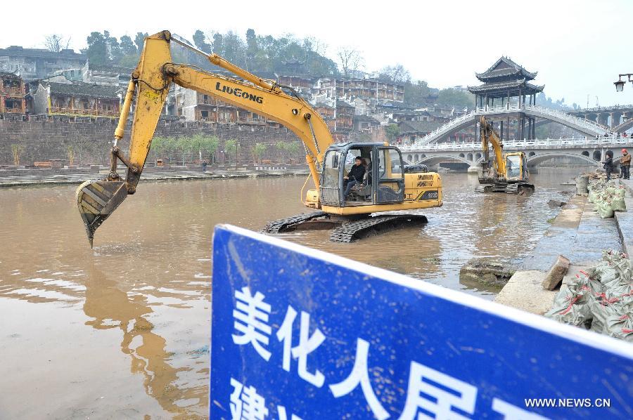 Excavators dredge the Tuojiang River in the ancient town of Fenghuang, central China's Hunan Province, Jan. 7, 2015. A dredging operation for the 3,900-meter-long Tuojiang River began on Tuesday and was estimated to be finished on Feb. 15. (Xinhua/Long Hongtao)