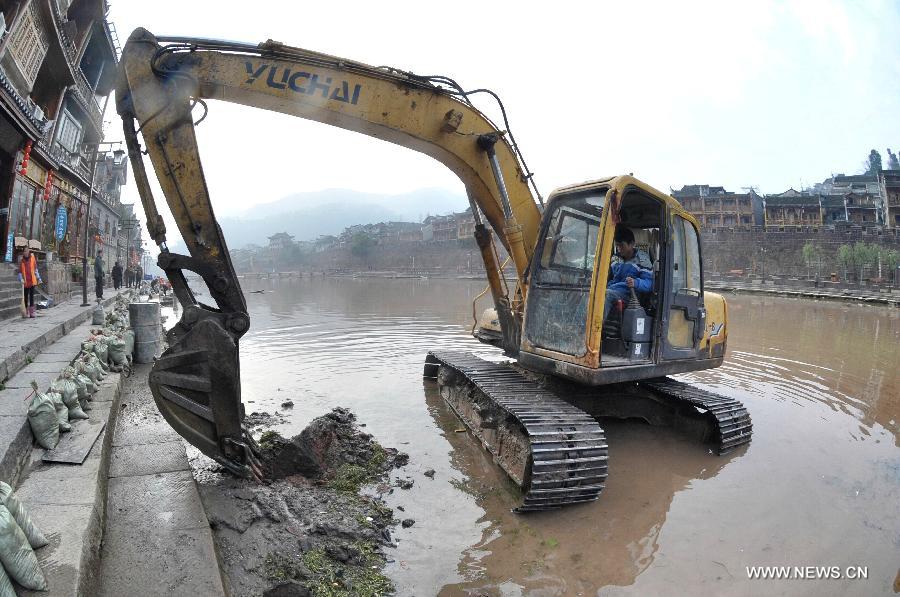 | A worker operates an excavator in dredging the Tuojiang River in the ancient town of Fenghuang, central China's Hunan Province, Jan. 7, 2015. A dredging operation for the 3,900-meter-long Tuojiang River began on Tuesday and was estimated to be finished on Feb. 15. (Xinhua/Long Hongtao) |