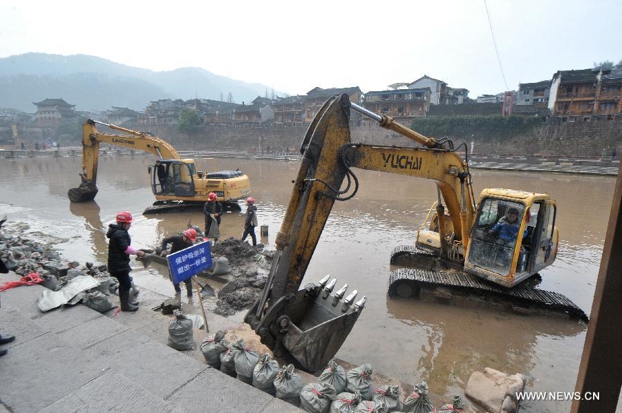 Workers, helped by excavators, dredge the Tuojiang River in the ancient town of Fenghuang, central China's Hunan Province, Jan. 7, 2015. A dredging operation for the 3,900-meter-long Tuojiang River began on Tuesday and was estimated to be finished on Feb. 15. (Xinhua/Long Hongtao)