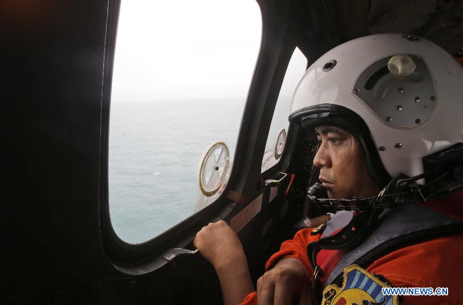 A crew member of an Indonesian Air Force NAS 332 Super Puma helicopter looks out of the window during a search operation for the victims of AirAsia QZ 8501 over the Java Sea off Pangkalan Bun, Indonesia, Jan. 6, 2015. The search operation for AirAsia Flight QZ8501 will spread slightly eastward on Tuesday as the weather and currents drag wreckage in that direction, the head of Indonesia's rescue agency said. (Xinhua/Pool/Achmad Ibrahim)