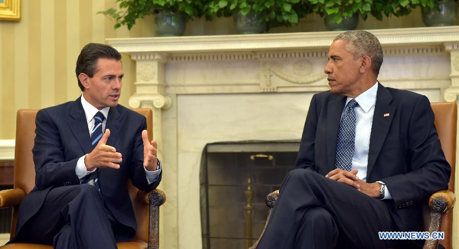 Image provided by Mexico's Presidency shows Mexican President Enrique Pena Nieto (L) meeting with his U.S. counterpart Barack Obama at the White House in Washington D.C. Jan. 6, 2015. Enrique Pena Nieto started a two-day official visit to the U.S. on Jan. 5. (Xinhua/Mexico's Presidency)