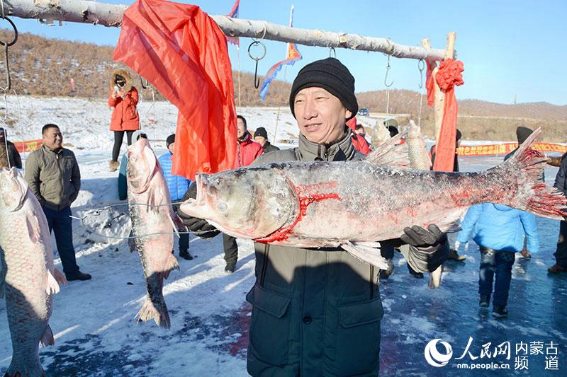 A tourist shows a big fish caught at the winter fishing festival in Zhalantun city, north China's Inner Mongolia, Jan. 2, 2015. (nm.people.cn/Han Leng)