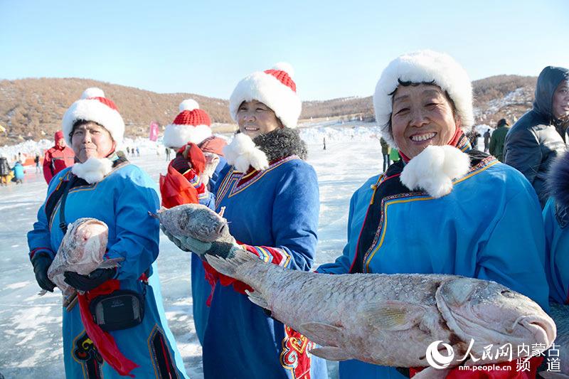 People of Elunchun ethnic group show fish caught at the winter fishing festival in Zhalantun city, north China's Inner Mongolia, Jan. 2, 2015. (nm.people.cn/Ji Mingguo)