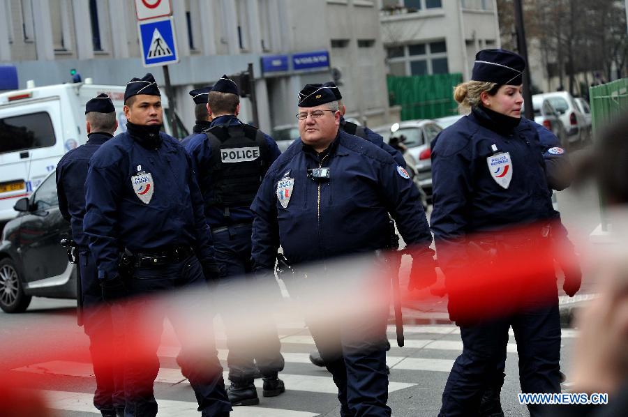 French police officers stand guard near the Paris office of Charlie Hebdo in Paris, France, Jan. 7, 2015. The office of Paris Prosecutor of the Republic confirmed at least 12 people were killed on Wednesday in a shooting at the Paris office of Charlie Hebdo, a satirical newspaper, adding four others were seriously wounded in the "terror attack." (Xinhua/Chen Xiaowei)