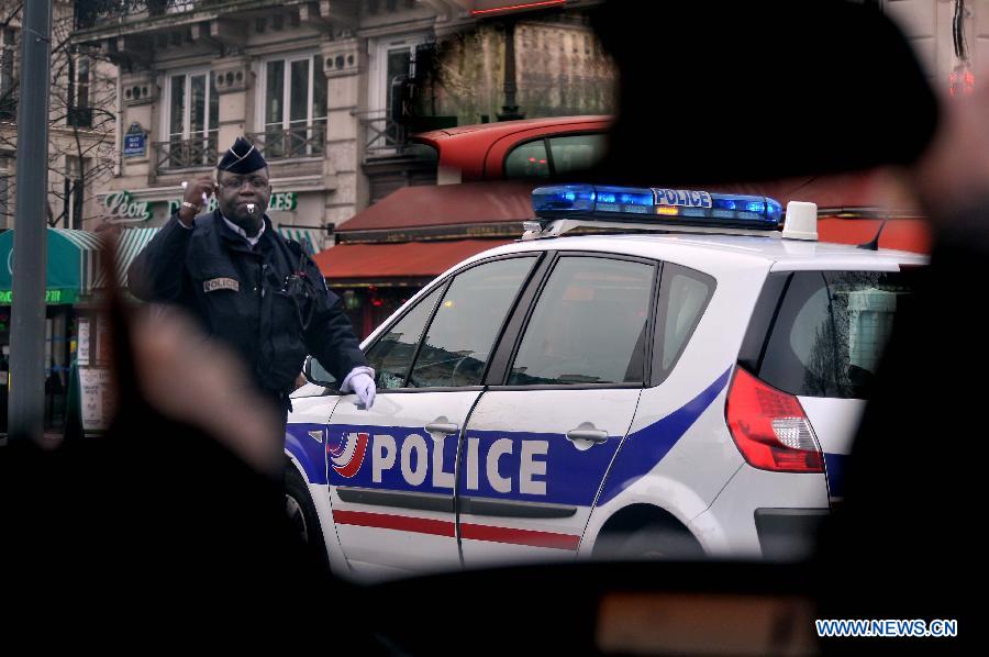 A police officer checks passing cars on the street in Paris, France, Jan. 7, 2015. The office of Paris Prosecutor of the Republic confirmed at least 12 people were killed on Wednesday in a shooting at the Paris office of Charlie Hebdo, a satirical newspaper, adding four others were seriously wounded in the "terror attack." (Xinhua/Chen Xiaowei)