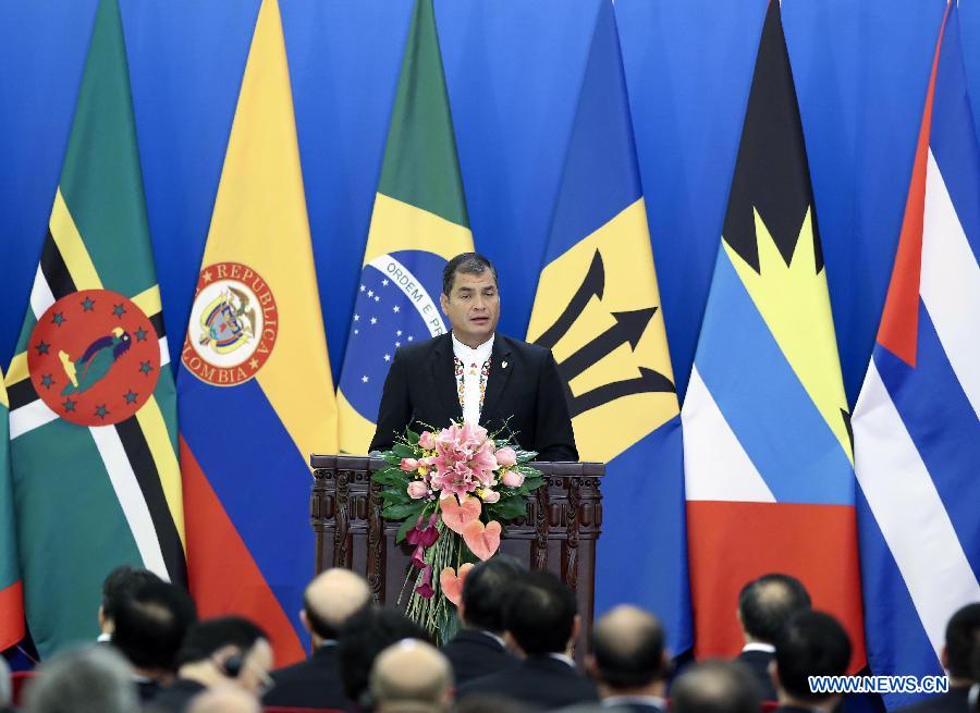 | Ecuador's President Rafael Correa Delgado speaks during the opening ceremony of the first ministerial meeting of the Forum of China and the Community of Latin American and Caribbean States (CELAC) in Beijing, capital of China, Jan. 8, 2015.(Xinhua/Ding Lin) |