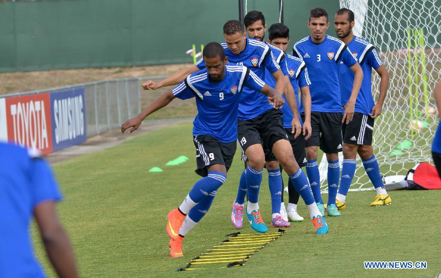 Players of the United Arab Emirates (UAE) national team attend a training session ahead of the AFC Asian Cup in Canberra, Australia, Jan. 7, 2015. The UAE's first match at this Asian Cup will be against Qatar in Canberra on Jan. 11, 2015. (Xinhua/Justin Qian)