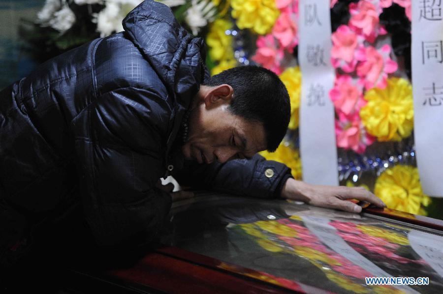 Firefighter Fu Renchao's father leans over the casket of Fu Renchao during the funeral for five firefighters in Harbin, capital of northeast China's Heilongjiang Province, Jan. 8, 2015. A serious fire broke out at a warehouse on Jan. 2 in Harbin that killed five firefighters. Of the deceased firefighters, the youngest was 18 years old and the oldest 22. (Xinhua/Wang Song)