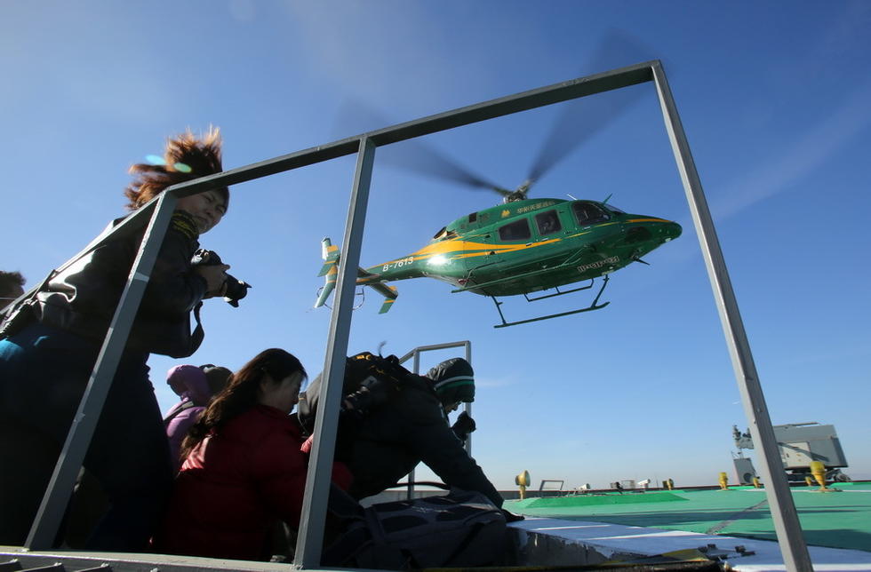 A Bell 429 helicopter lands on the parking apron of the 330-meter-high China World Trade Center Tower 3 on Jan. 6, 2015, which signifies that the highest parking apron in Beijing officially came into use. On that day, two other helicopters also landed on this parking apron. (Beijing News/Li Dong)
