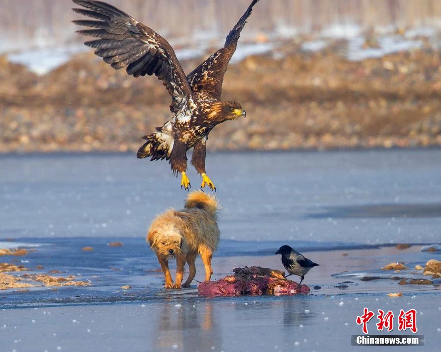Photo shows the white-tailed eagles fishing in Yili, northwest China's Xinjiang autonomous region in winter. Some ducks and stray dogs nearby also came to share the food of the eagles. Thanks to the recovery of the ecologic environment of Ili River Basin, more and more white-tailed eagles come to spend winter there. (CNS/Yang Yongguang)