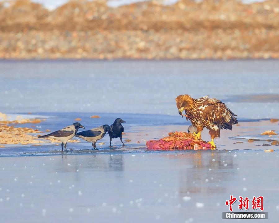 Photo shows the white-tailed eagles fishing in Yili, northwest China's Xinjiang autonomous region in winter. Some ducks and stray dogs nearby also came to share the food of the eagles. Thanks to the recovery of the ecologic environment of Ili River Basin, more and more white-tailed eagles come to spend winter there. (CNS/Yang Yongguang)
