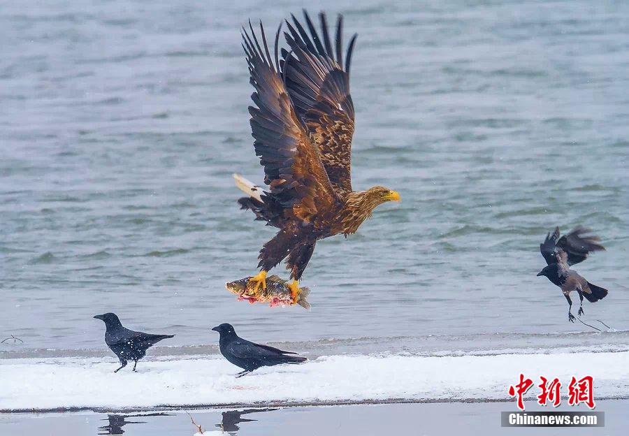 Photo shows the white-tailed eagles fishing in Yili, northwest China's Xinjiang autonomous region in winter. Some ducks and stray dogs nearby also came to share the food of the eagles. Thanks to the recovery of the ecologic environment of Ili River Basin, more and more white-tailed eagles come to spend winter there. (CNS/Yang Yongguang)
