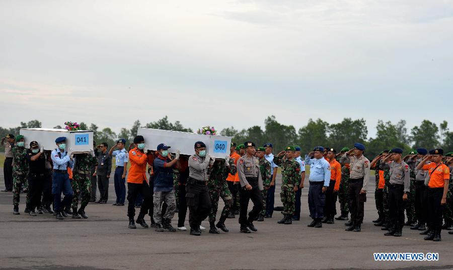 Rescuers carry coffins containing the bodies of victims of AirAsia flight QZ8501 in Pangkalan Bun, Indonesia, on Jan. 8, 2015. So far, 44 bodies have been discovered by a multinational search team. (Xinhua/He Changshan)
