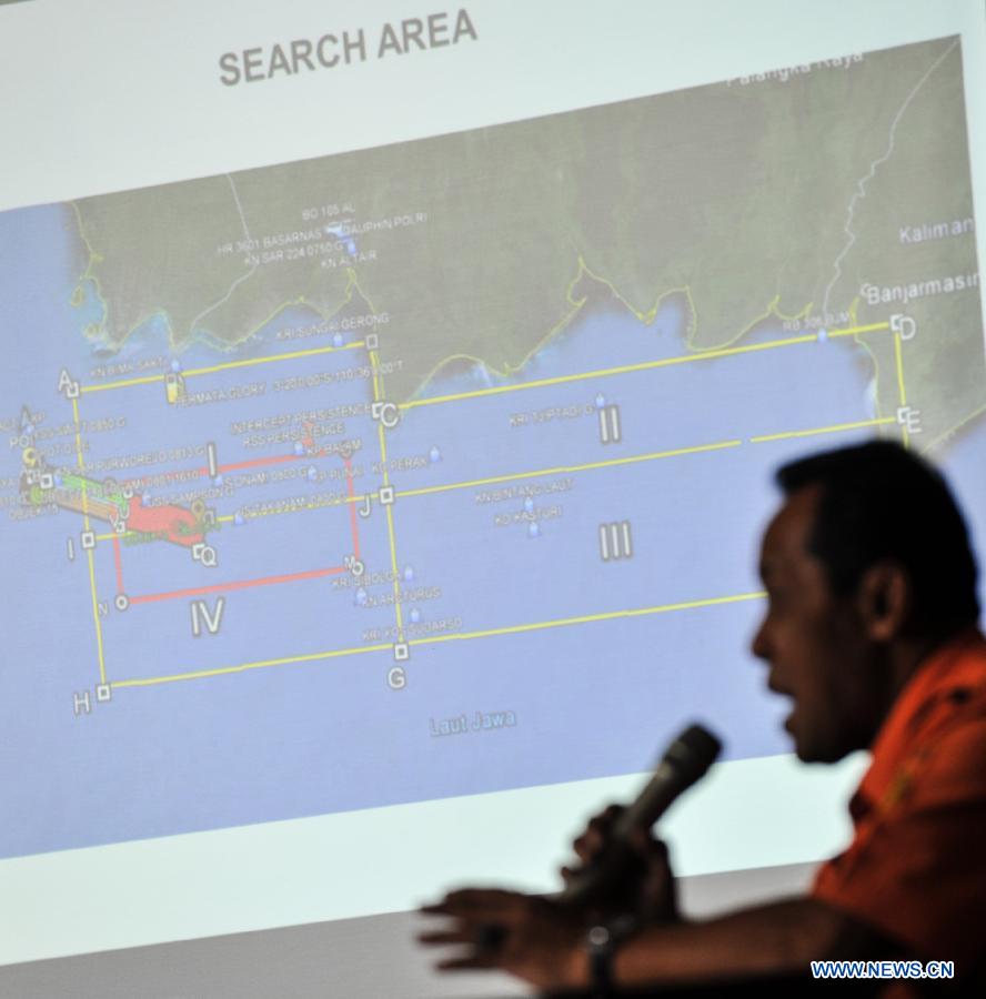 Bambang Soelistyo, head of Indonesia's National Search and Rescue Agency, shows the possible area of the blackbox during the 13th searching and evacuation of the AirAsia Flight QZ8501, in Jakarta, Indonesia, Jan. 9, 2015. (Xinhua/Veri Sanovri)