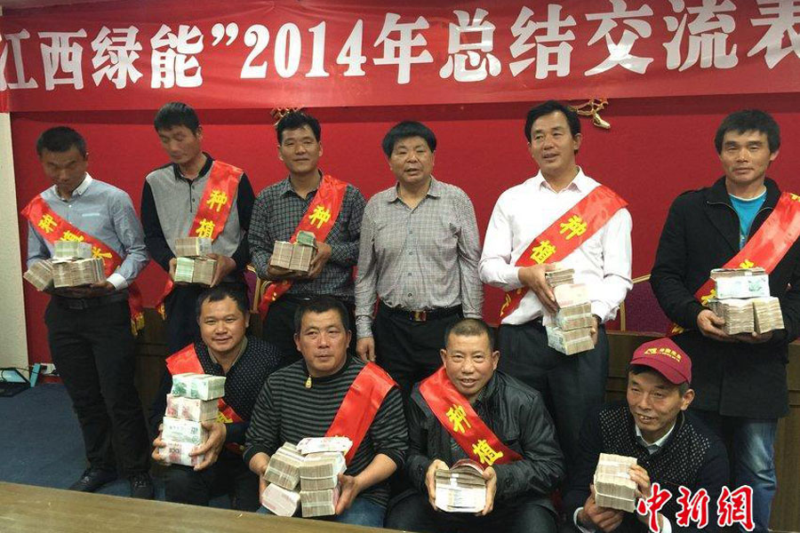 An entrepreneur in Nanchang, China's Jiangxi Province, awarded 87 farmers nearly 3 million yuan (over 460,000 U.S. dollars) in bonuses on January 8, 2015.