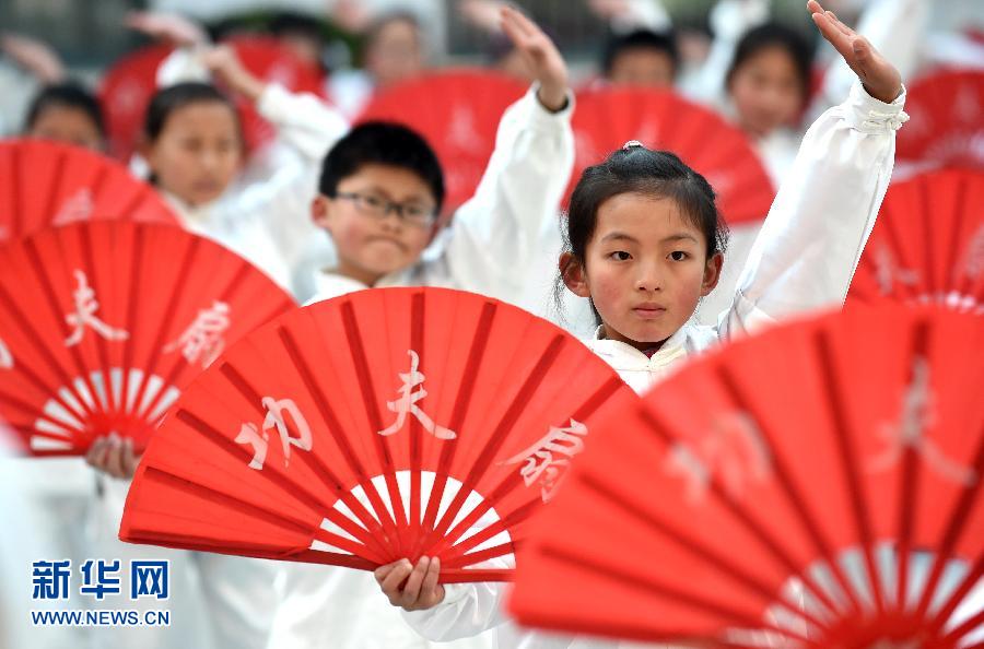 | Students playing Tai Chi Kong Fu Fan form an eight-diagram pattern in Langxi Road Primary School, Yaohai, Hefei on Jan. 8, 2015. (Xinhua) |