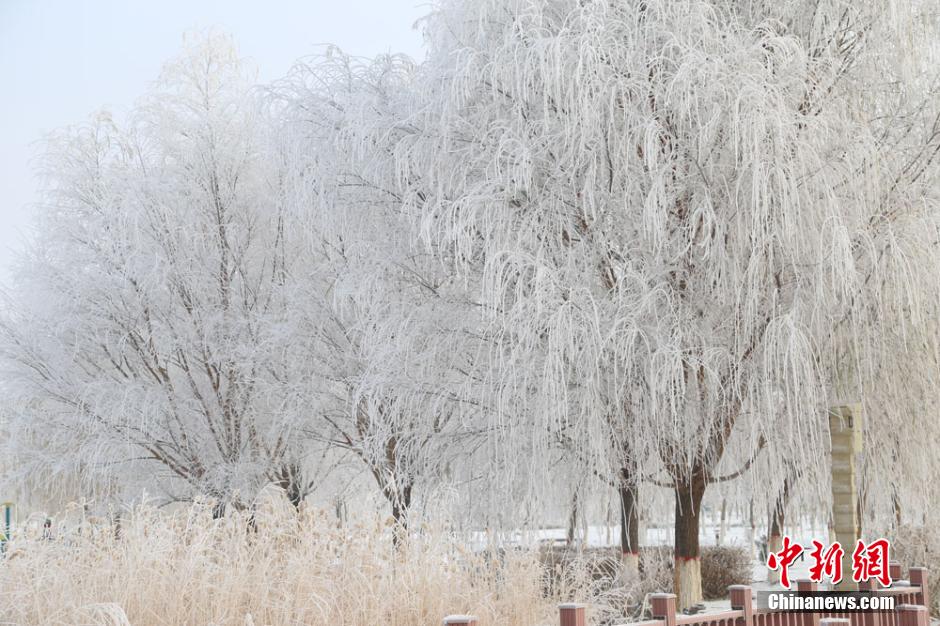 After several days of cold wave, intoxicating scenes of rime appear in Bohu county, Xinjiang, Jan. 9, 2015. People feel like in a fairyland at the Baixin Park of Bohu. (Chinanews/Nian Lei)