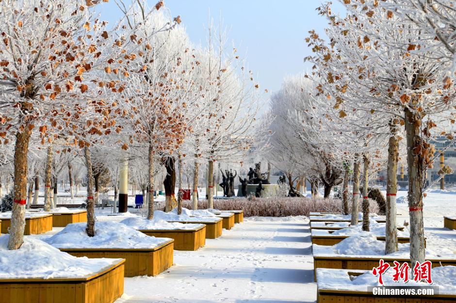 After several days of cold wave, intoxicating scenes of rime appear in Bohu county, Xinjiang, Jan. 9, 2015. People feel like in a fairyland at the Baixin Park of Bohu. (Chinanews/Nian Lei)