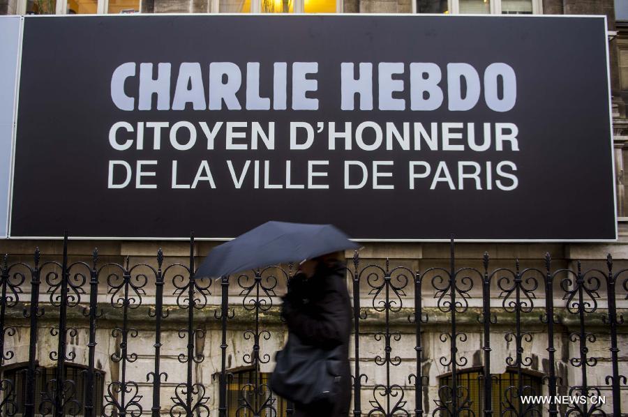A pedestrian walks past an advertisement of Charlie Hebdo in Paris, France, on Jan. 9, 2015. Paris on Friday made the satirical magazine Charlie Hebdo an "honorary citizen" as part of support to the weekly which lost its main cartoonists in a deadly shooting on Wednesday. (Xinhua/Chen Xiaowei)