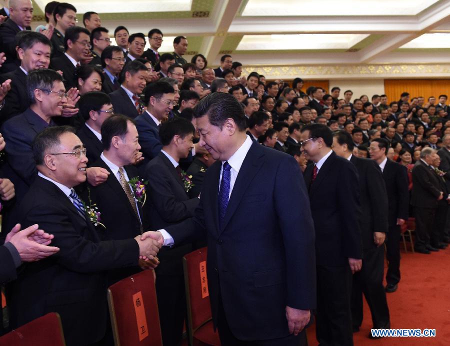 Chinese President Xi Jinping (R front) and other Chinese top leaders meet with representatives attending the presenting ceremony of China's 2014 State Top Scientific and Technological Awards before the ceremony at the Great Hall of the People in Beijing, capital of China, Jan. 9, 2015. (Xinhua/Li Xueren)