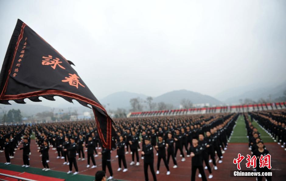 10,021 students from Sichuan Southwest College of Civil Aviation practice Wing Chun in Chengdu, southwest China's Sichuan province, Jan. 8, 2015. (CNS/Liu Zhongjun)