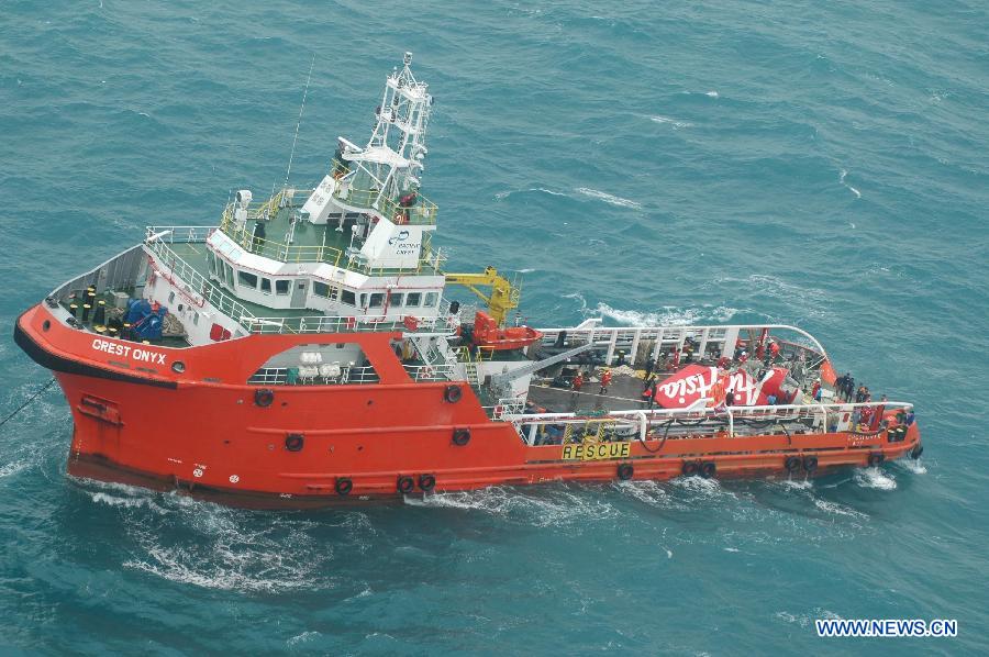 The tail section of crashed AirAsia flight QZ8501 is hoisted from the Java Sea, in Indonesia, Jan. 10, 2015. The tail section of crashed AirAsia flight QZ8501 was hoisted from the Java Sea off Indonesia's Central Kalimantan coast on Saturday as weather condition in the search area improved. (Xinhua)