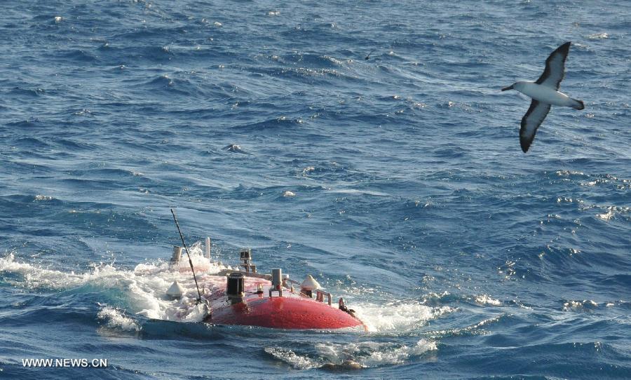 China's deep-sea manned submersible Jiaolong comes out of water as a sea bird takes flight around it in the southwest Indian Ocean, Jan. 10, 2015. Jiaolong carried out an exploration mission to study active hydrothermal vent in the southwestern Indian Ocean. (Xinhua/Zhang Xudong)