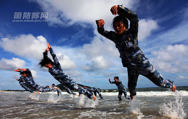 They are the soldiers in Chinese Marine Corps. From the land to the sea, from the forest to the desert island, the female soldiers shed their sweat. Tough training makes them strong and unbeatable. (Photo source: microblog of PLA Daily)
