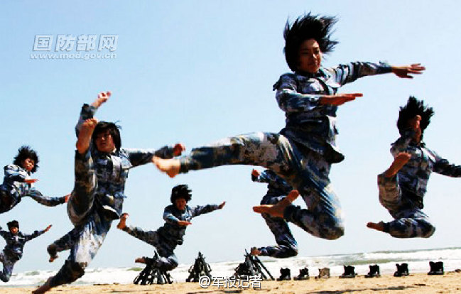 They are the soldiers in Chinese Marine Corps. From the land to the sea, from the forest to the desert island, the female soldiers shed their sweat. Tough training makes them strong and unbeatable. (Photo source: microblog of PLA Daily)