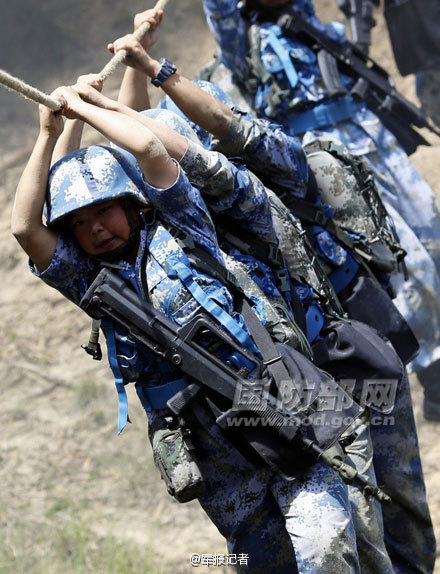 They are the soldiers in Chinese Marine Corps. From the land to the sea, from the forest to the desert island, the female soldiers shed their sweat. Tough training makes them strong and unbeatable. (Photo source: microblog of PLA Daily)
