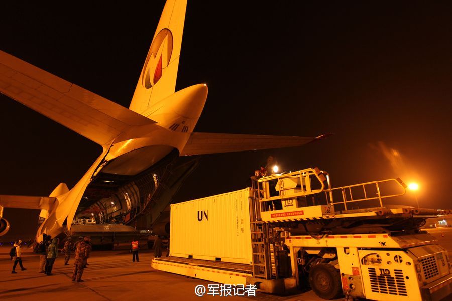 China's first team of peacekeeping battalion departs from east China's Shandong province, Jan. 8, 2015. The team consists of 24 soldiers. Six flew from Yaoqiang Airport in Jinan and 18 flew from Laishan Airport in Yantai. The six soldiers escorted materials and equipment in a An-124 cargo plane. (Photo/81.cn)